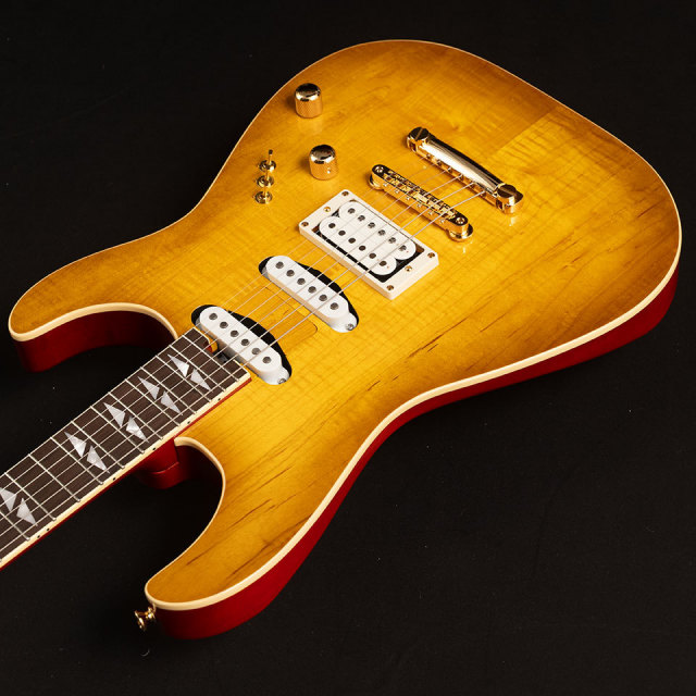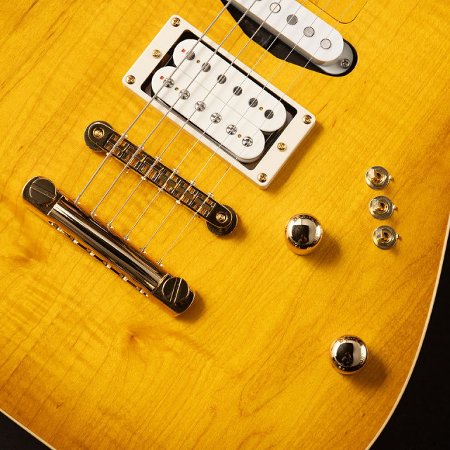 80年代をコンセプトにしたこちらのシリーズ。こちらデラックスモデルはTokaiのVSシリーズにもオマージュを重ねたコンセプトのカラーリング。こちらはVSでもあったハニーバーストに近い、レモンドロップを採用。