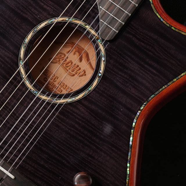 オープン・スタイルのヘッドストック・デザインは、軽量化を考慮しただけでなく、クラシックな美しさを誇り、ギター全体のデザイン・スタイルによりマッチしています。マザー・オブ・パールのヘッド・ロゴをはめ込むことで、Bromo Guitarsのアイコンである山型のデザインがより強調されています。