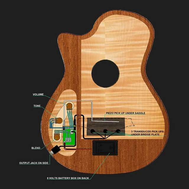 ピックアップシステム Piezo under Bridge Saddle + 3 Transducer Pick Up Under Bridge Plate.