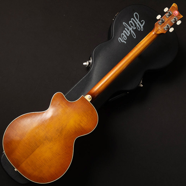 完全なホロウ・ボディとショート・スケール(30インチ)のネックは、軽量で演奏しやすく、ドイツ製独特のヴィンテージ・サウンド。当時と同様、スプルース・トップのフレイム・メイプル製ホロウボディ。Beech材で補強された3ピース・メイプル・ネックとローズウッド指板。サンバースト仕上げ。