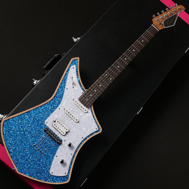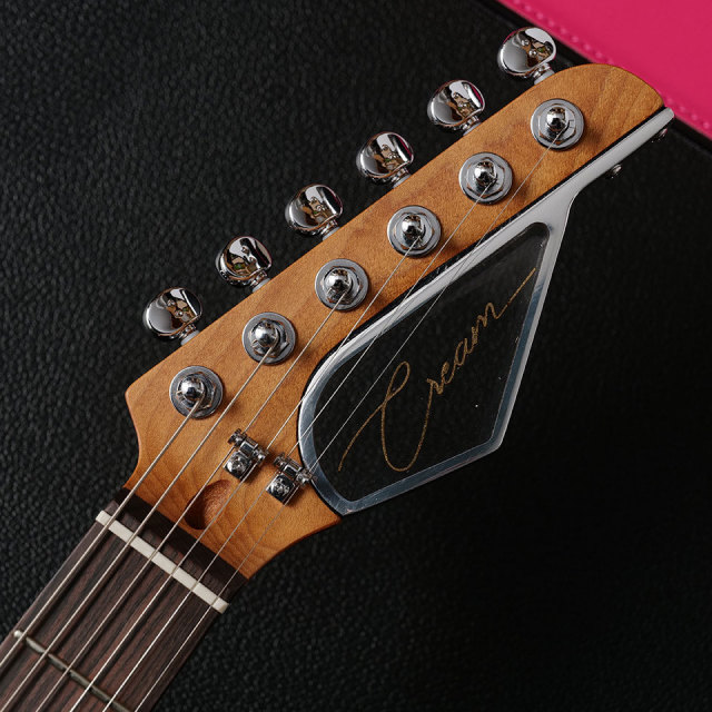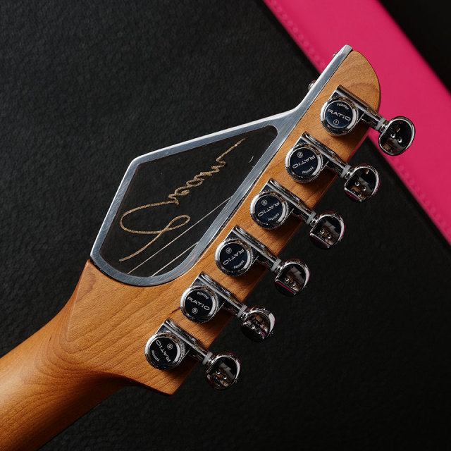 特徴的なボディシェイプにボディバックはなんと1ピースマホガニーを使用、ボディバックにはネックジョイントから弦の裏通し部分までのブラスプレートを搭載、ヘッドストックもウッドと樹脂をメタルパーツで組み合わるといった、差し詰めオリジナリティの塊といったところです。