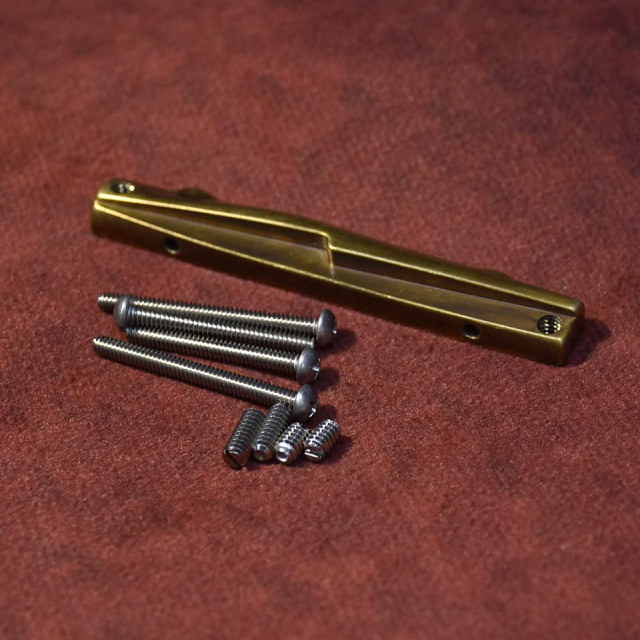 従来の3サドル配置に見られる6つの接点ではなく、ブラスナックルとブリッジプレートの間のわずか2つの接点を通して、6本の弦のエネルギーをすべて伝達することができます。