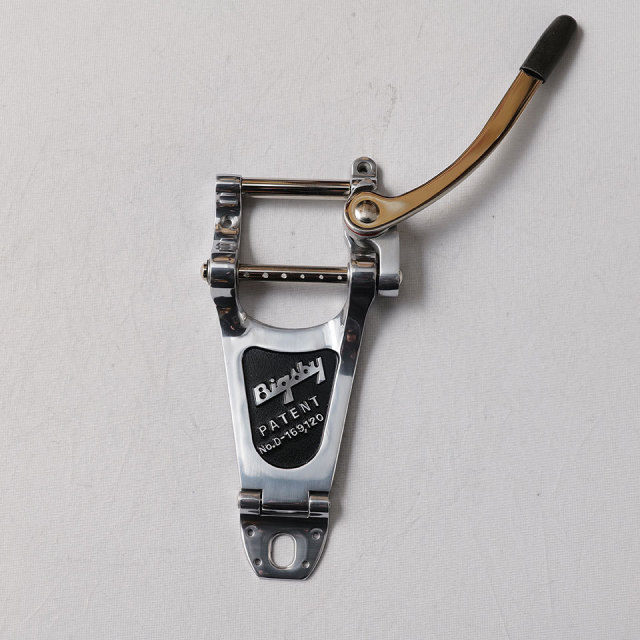 Bigsby B7は、B3とB5を組み合わせたもので、ブリッジ上の弦のブレイクアングルを大きくするテンションバーが特徴です。ストリングスルー式のB7は、弦のボールエンドをストリングバーのポストに通す必要がないため、弦交換が容易に行えるピンレスデザインです。Gibson Les Paul Standard/Custom、Gibson 335を含むアーチトップソリッドボディ/セミホロウボディのギター向け設計されています。