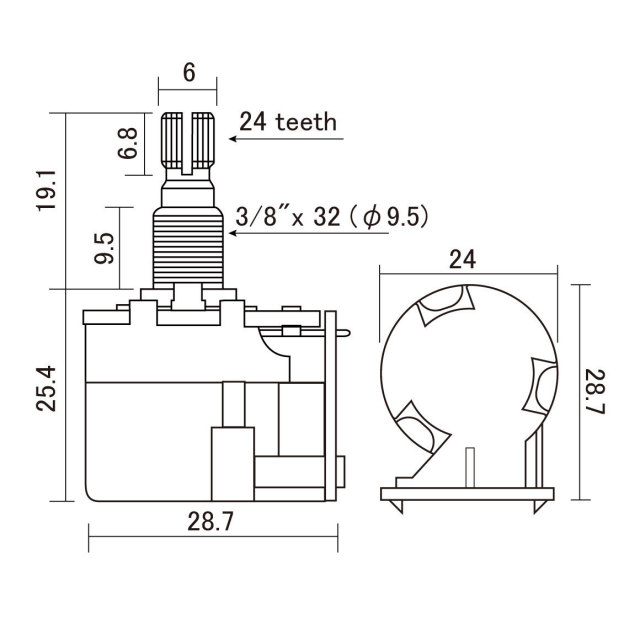 CTS製のインチ規格、プッシュプルポットSCUD/CTS-A250-PP。シングルコイルPUに主に用いられる抵抗値250kΩ Aカーブ仕様です。