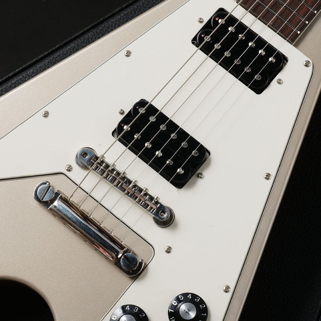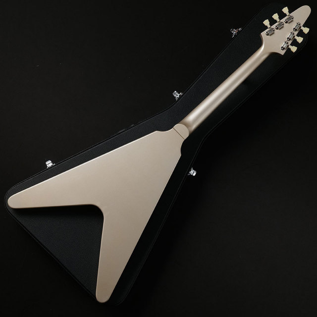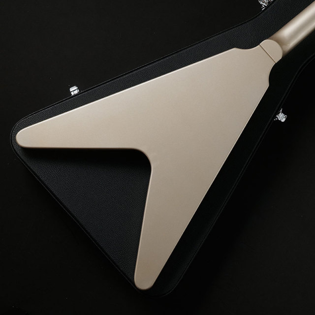 フライングVとしての基本的な設計はG社の67年FVをサンプルとし、薄型ボディ厚、ヘッド角、ネックの握りも忠実に再現しています。ボディ&ネックのマテリアルも本家と同じくマホガニーを使用、全体で3.02 kgと軽量な材をセレクト。