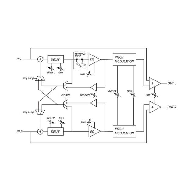 3つのエコー・スタイルが用意されており、それぞれのスタイルでディレイ・フィードバック・パス専用のルーティングを設定します。「Dual stereo "は2つの独立したエコーを提供し、モノラルでスタックすることも、各ステレオ・チャンネルからルーティングすることもできます。ping pong "モードでは、それぞれのディレイがもう一方のディレイにフィードバックし、クラシックなステレオ・ピンポン・サウンド(各リピートが左右のチャンネル間でバウンドする)、またはマルチタップ・ディレイ・エフェクト(モノラルで使用する場合)を作り出します。最後のモードはモノ・ディレイで、フィードバック・パスをIN R、OUT R端子にルーティングするので、エコーのフィードバック・パスに外部エフェクトを使用できます。