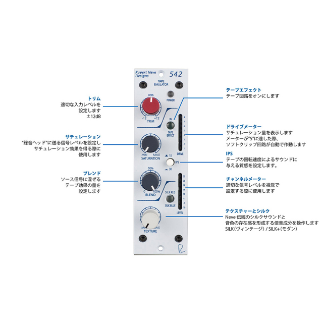 Silk モードはいずれも ”Texture” コントロールで制御します。Texture コントロールを操作することにより、Silk のかかり具合を 0 から、オリジナル Portico シリーズ搭載の Silk 機能の約4倍程度まで設定できます。Silk / Texture が有効の場合、ディストーションのキャラクター、および倍音成分は、Rupert Neve 氏設計のビンテージクラスAデザインのサウンドを思い起こさせてくれることでしょう。こうしたコントロールは、542 の音色のバリエーションに新しい領域を切り開いてくれるもので、「トゥルーテープ」機能と組み合わせて、クリエイティブな使い方を探求し続けていただきた いと願っています。