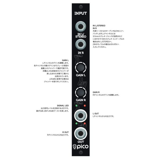Pico Inputはモジュラーシンセ・システムに外部のシンセサイザーやmp3プレイヤー、スマートフォンのオーディオ信号をモジュラーシンセレベルの音量に増幅するインターフェースモジュールです。【製品特徴】