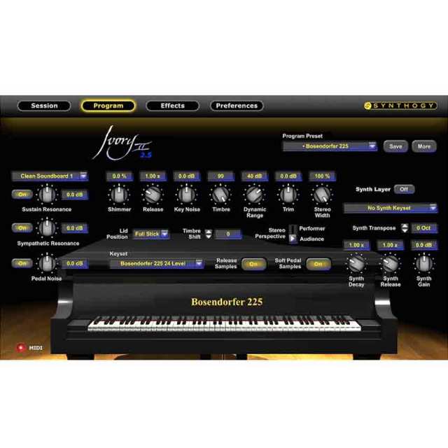 Ivory II Studio Grandsは、数々のグラミー受賞・ノミネート作品を送り出した米国カリフォルニア、コネチカット2つのスタジオで、万全にメンテナンスされた2つの『スタジオ・グランド』ピアノを収録するヴァーチャル・ピアノ音源です。単に膨大なサンプルを収録するだけでなく、Ivory II Studio Grandsは驚くほど自然なサウンドとピアノそのものの振る舞いを備えています。各モデルの細かなディテール、ニュアンスにいたるまで、長年に渡るSynthogyのプログラミングおよびDSPテクノロジーによってソフトウェアで実現しました。プラグインまたはスタンドアローンで動作します。