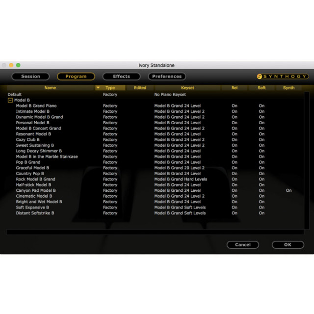 ・基本的なピアノ音色プログラム、調律/音像/ベロシティ設定を含んだセッション、エフェクト設定、お使いのキーボードに合わせたベロシティ設定など、様々な単位で保存/管理可能なユーザープリセット。