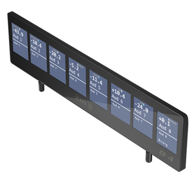 iCON/P1-Xにこちらのオプションの D4 OLED ディスプレイを使用すると、名前、パン、各チャンネルのさまざまなコントロールパラメーターなどの重要なチャンネル情報にアクセスできます。
