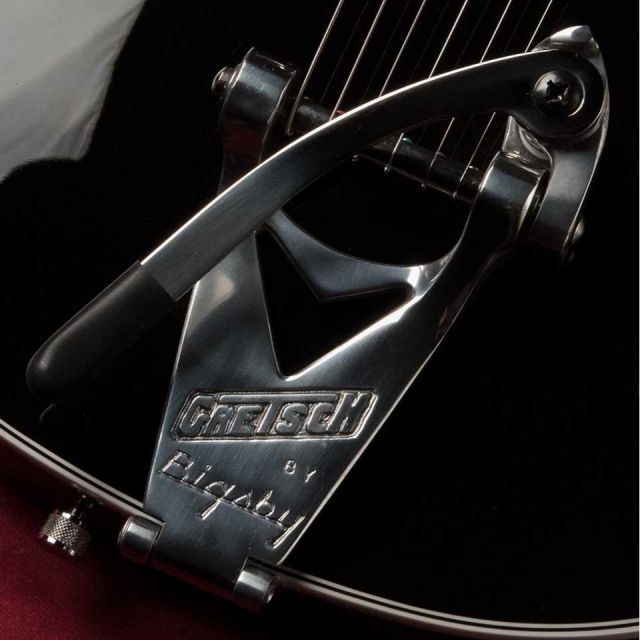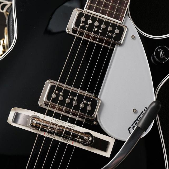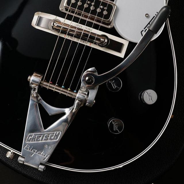 Gretsch Custom Shop において 2011年に行われた一大プロジェクト「George Harrison Tribute Duo Jet」での実機の計測が反映されたボディー構造。彼が手にした時から既にブラックだったイレギュラーなボディーバックのカラーや、ビグスビーのハンドルが黒いプラスネジが使われている点、さらにセンターからズレた位置で装着されているストラップピンも見事に再現!!