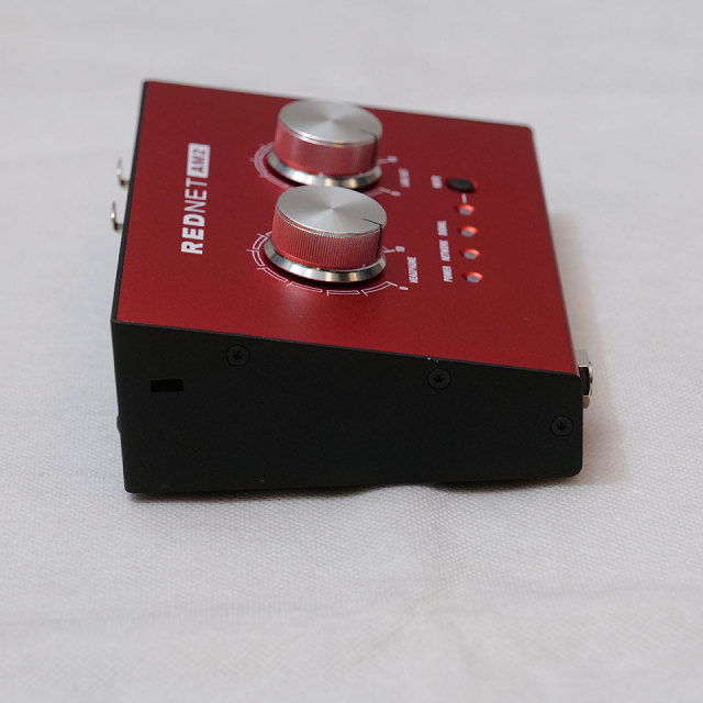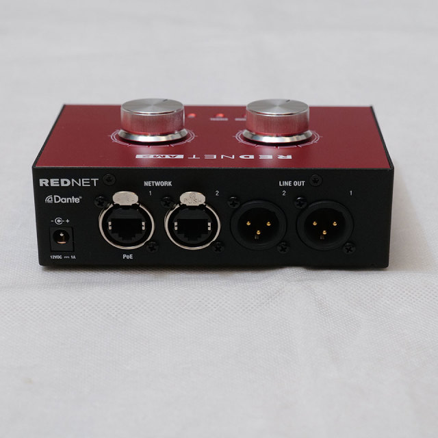 RedNet AM2は、最新の2チャンネルDante受信コンポーネントを搭載し、高品質なD/Aコンバーターによる96KHz変換、ヘッドフォンやスピーカで正確なモニタリングが可能です。2つのボリューム・コントロール・ノブで、ヘッドフォン、ライン出力のレベルを調整することができ、ライン出力にはLED付きのミュート・ボタンも設けられています。電源やネットワーク状況も同様にLEDで確認することが可能です。