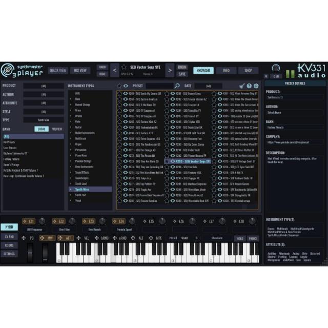 KV331 Audio社が誇る主力製品『SYNTHMASTER 3』の簡易版として位置づけられる本作『SynthMaster 3 Player』は、サウンドを一からデザインするよりも既存のプリセットを微調整することを好むユーザー向けに設計されており、ソフトウェアシンセサイザー『SynthMaster One』、『SynthMaster 2』、『SynthMaster 3』に収録されている膨大なファクトリープリセットをすべて付属。 レイヤーのボイス、ゾーン、エフェクト、アルペジエーター、シーケンサーのパラメータを編集したり、プリセットを新しいレイヤーにロードしてマルチレイヤーパッチやドラムキットを作成する事も可能です。