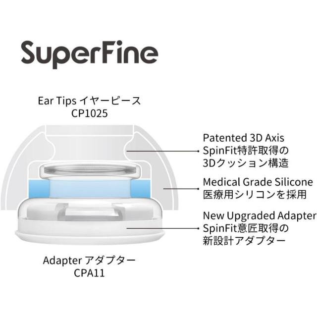 SpinFit SuperFine(スピンフィット スーパーファイン)は、AirPods Pro(第1世代・第2世代)専用に設計された高品質イヤーピースセットです。意匠取得の専用アダプターと医療グレードシリコンを採用し、快適な装着感と高い耐久性を両立。サイズはL、ML、M、S、SSの5種類をラインアップし、幅広い耳の形に対応します。